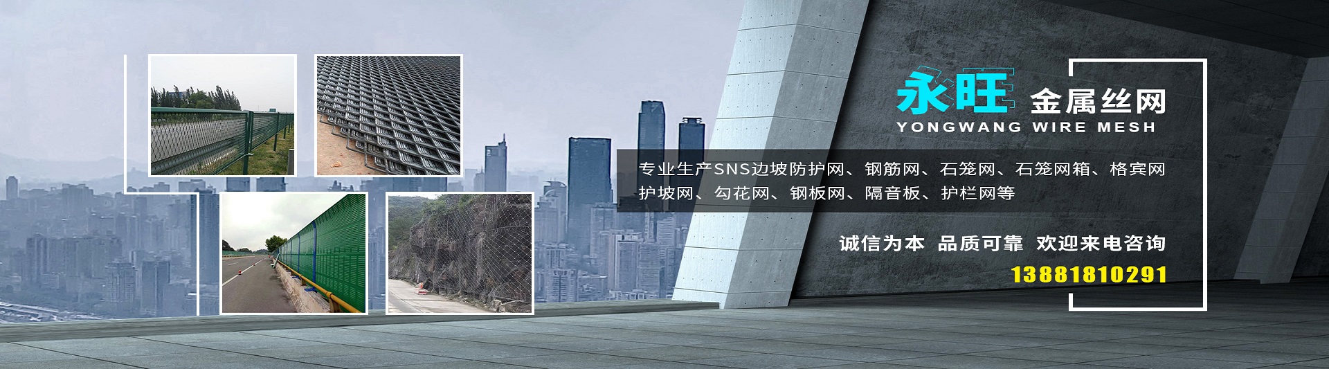 服務(wù)熱線: 成都市永旺金屬絲網(wǎng)有限公司是一家研發(fā)、生產(chǎn)、加工、銷售為一體的責(zé)任制企業(yè)公司。本公司“以誠信為本、以服務(wù)社會(huì)已任、以科學(xué)創(chuàng)新為理念”。 專業(yè)生產(chǎn)SNS邊坡防護(hù)網(wǎng)、鋼筋網(wǎng)、石籠網(wǎng)、石籠網(wǎng)箱、格賓網(wǎng)、護(hù)坡網(wǎng)、勾花網(wǎng)、鋼板網(wǎng)、隔音板、護(hù)欄網(wǎng)等。產(chǎn)品主要運(yùn)用于鐵路,高速公路,橋梁,隧道,機(jī)場,礦山,河道,球場,碼頭,港口等多個(gè)領(lǐng)域。 本公司期待與您長期合作,希望與您共創(chuàng)輝煌,我們愿與各業(yè)朋友精誠合作,共創(chuàng)美好未來,希望各業(yè)朋友來函來電